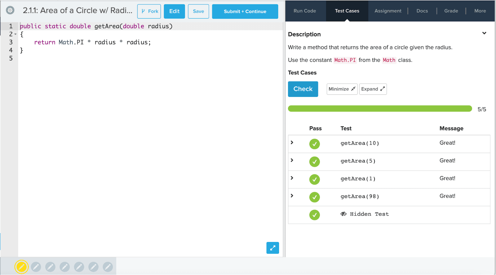 As an intern at CodeHS, my projects involved implementing new web page designs for the site and improving the internal tools the CodeHS team uses. Specifically, I implemented a new design for the test cases tab on practice problems and exercises across the site. It now includes a progress bar to show students how far along they are in passing the test cases as well as a streamlined design that clarifies the results of grading student work. It was a part of the site that had not been updated since I used CodeHS in high school, and I was excited to contribute to such a critical part of the platform.